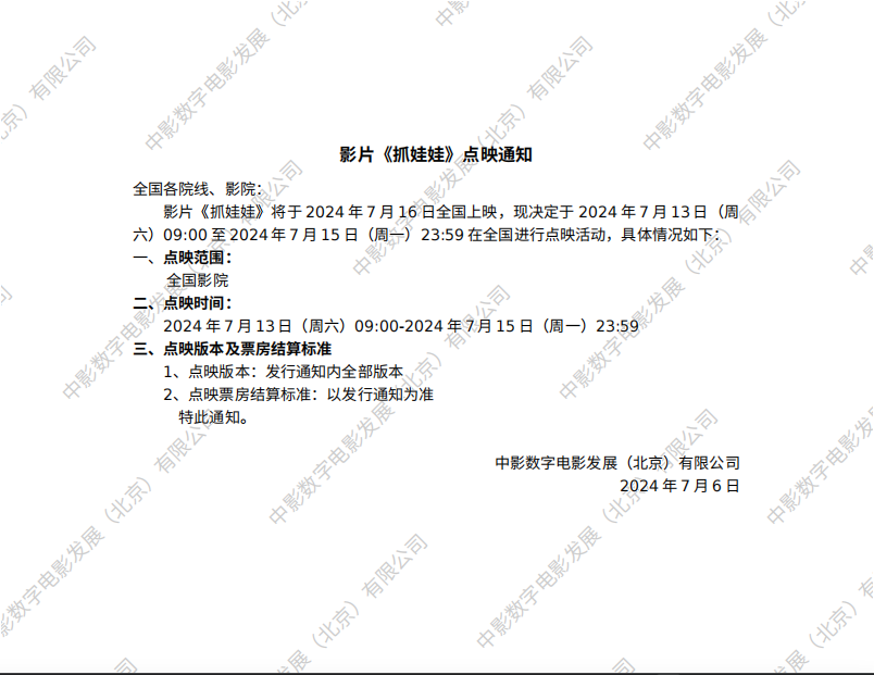 《抓娃娃》提档的通知