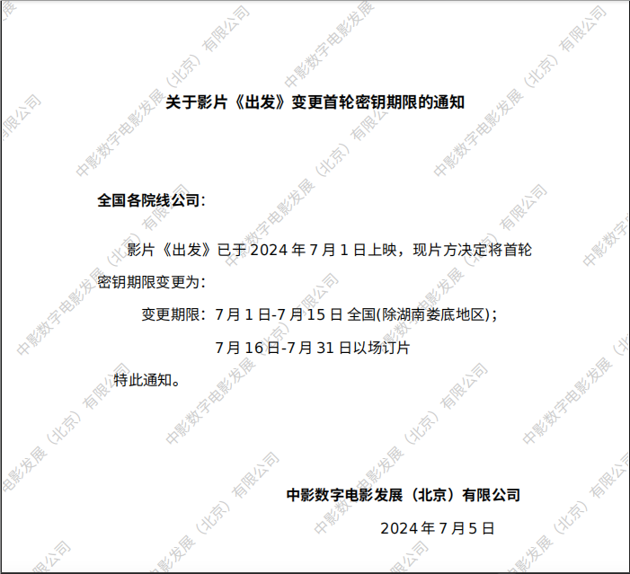 关于影片《出发》密钥延期的通知