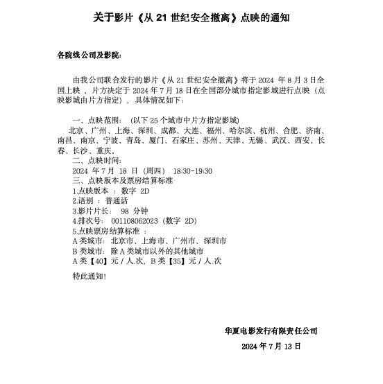 《从21世纪安全撤离》第五轮点映的通知