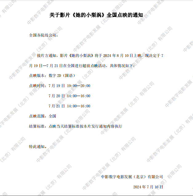《她的小梨涡》全国点映的通知