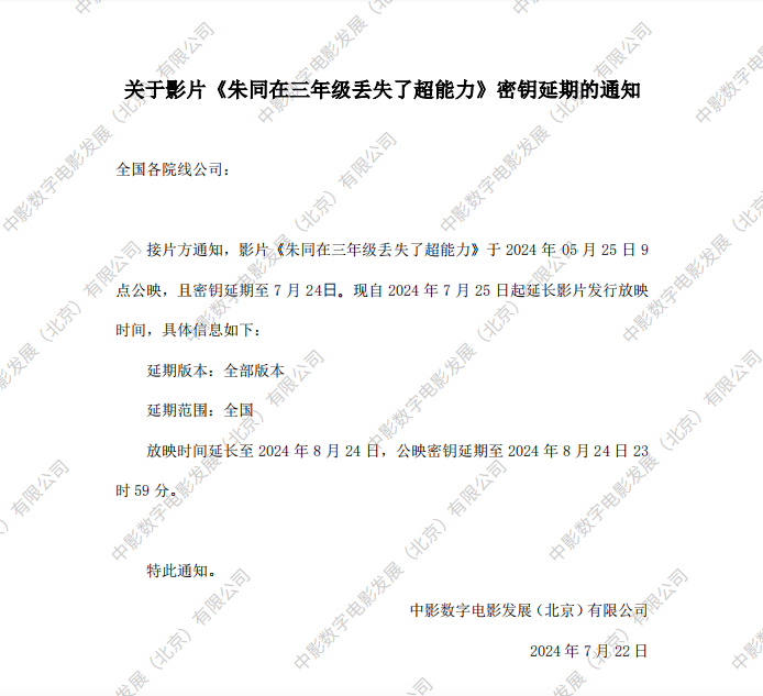 《朱同在三年级丢失了超能力》密钥延期的通知