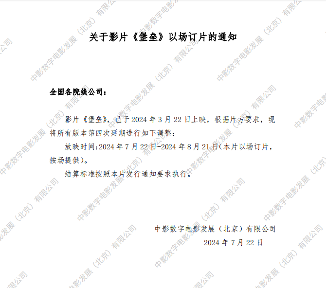 《堡垒》第八次以场订片的通知