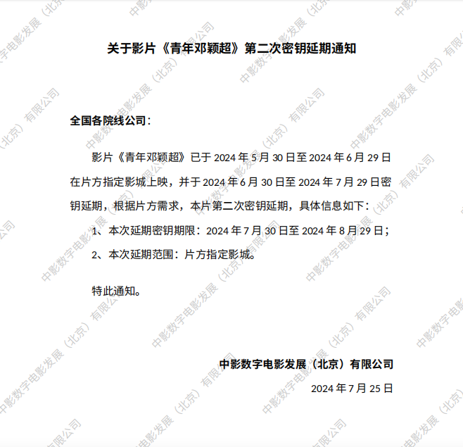 《青年邓颖超》第十次密钥延期的通知