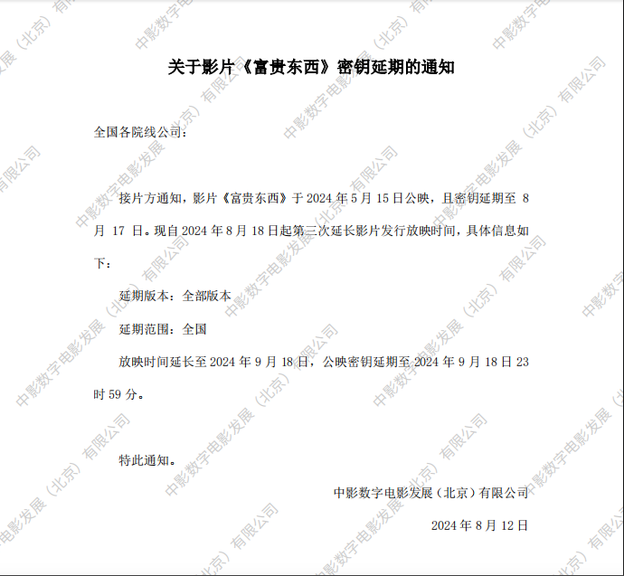 关于影片《富贵东西》密钥延期的通知
