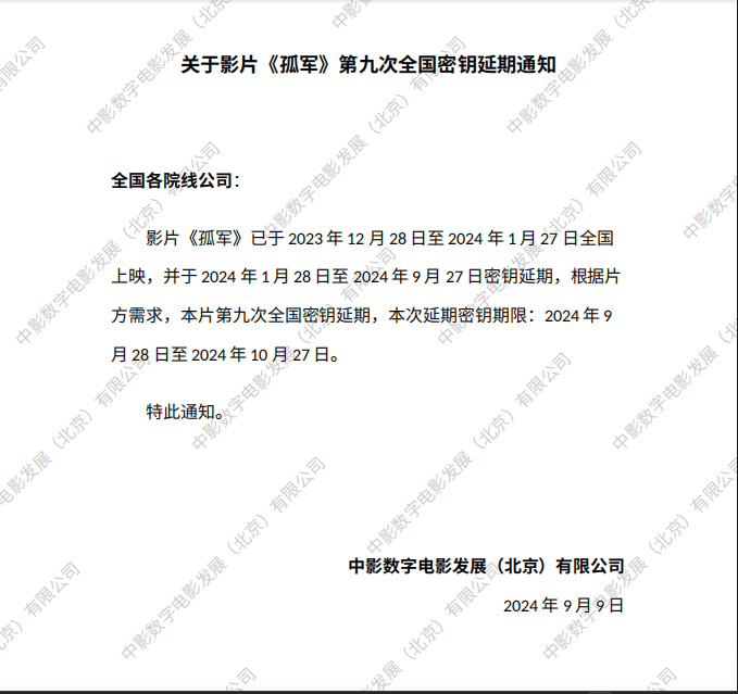 《孤军》第十五次全国密钥延期的通知