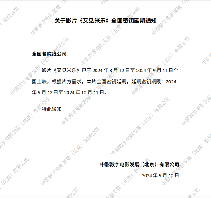 关于影片《又见米乐》第二次全国密钥延期通知