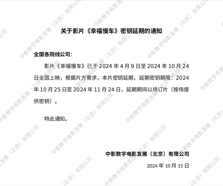 关于影片《幸福慢车》密钥延期的通知