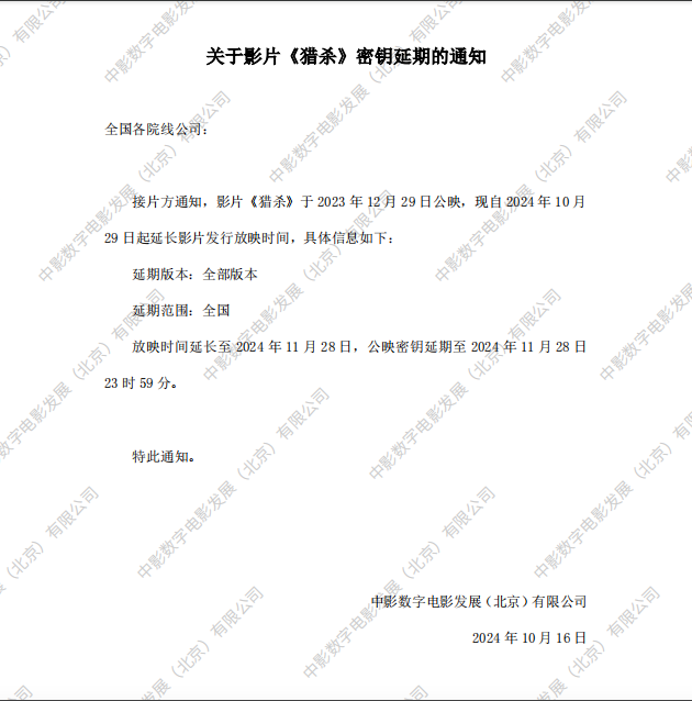 关于影片《猎杀》第八次密钥延期的通知