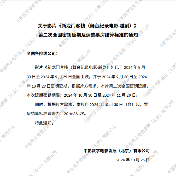 《新龙门客栈(舞台纪录电影·越剧)》第九次全国密钥延期的通知