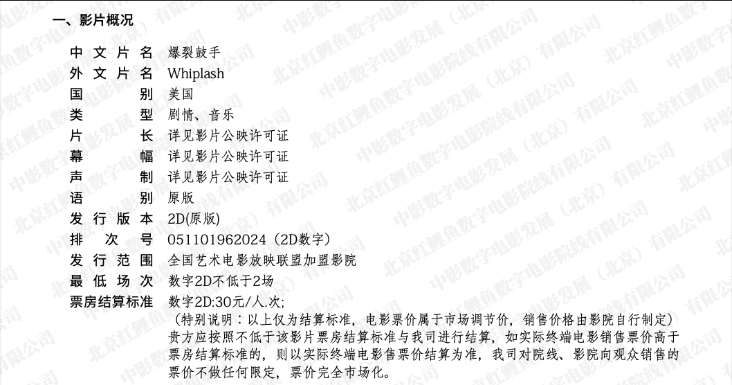 全国艺术电影放映联盟《爆裂鼓手》排片指导建议函