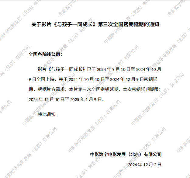 关于影片《与孩子一同成长》全国密钥延期及调整票房结算标准的通知