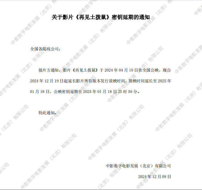 《再见土拨鼠》调整票房结算标准的通知