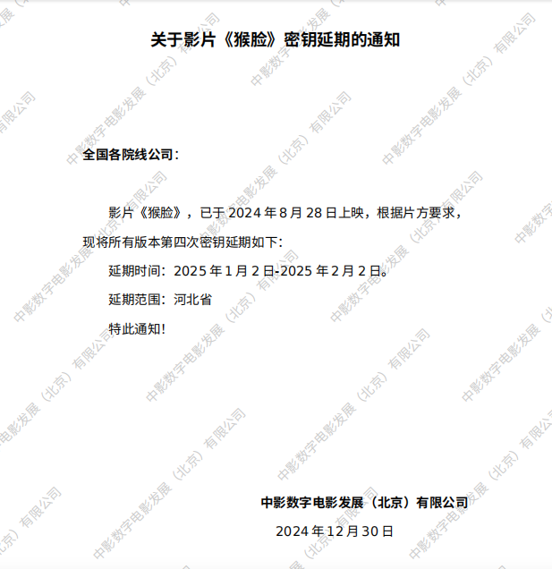 《猴脸》第三次密钥延期的通知