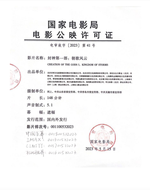 排 次 号:数字2D:001100532023、IMAX 2D:001300532023、CINITY 2D:001700532023