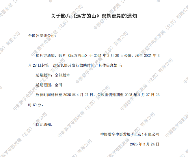 关于影片《远方的山》第五次密钥延期的通知