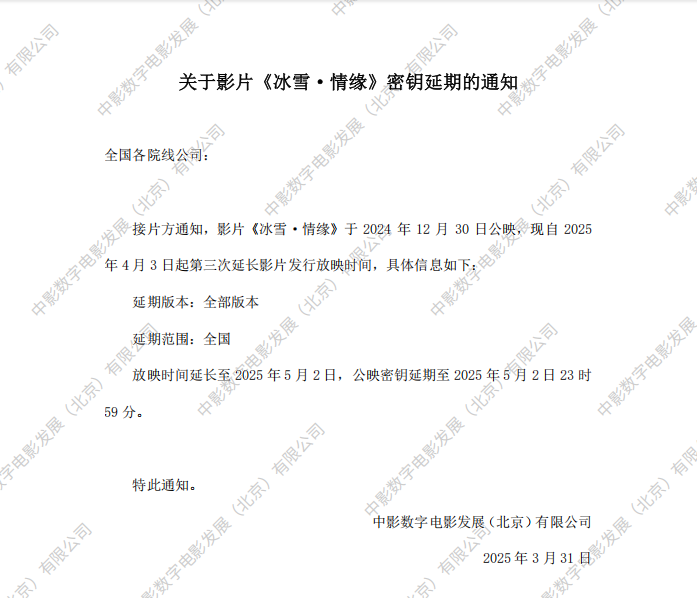 关于影片《冰雪·情缘》第八次密钥延期的通知