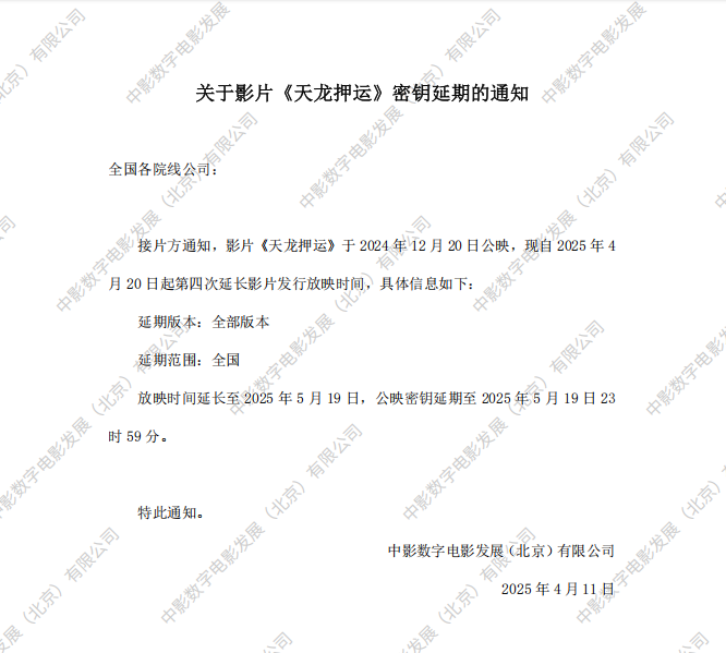 《天龙押运》档期变更的通知