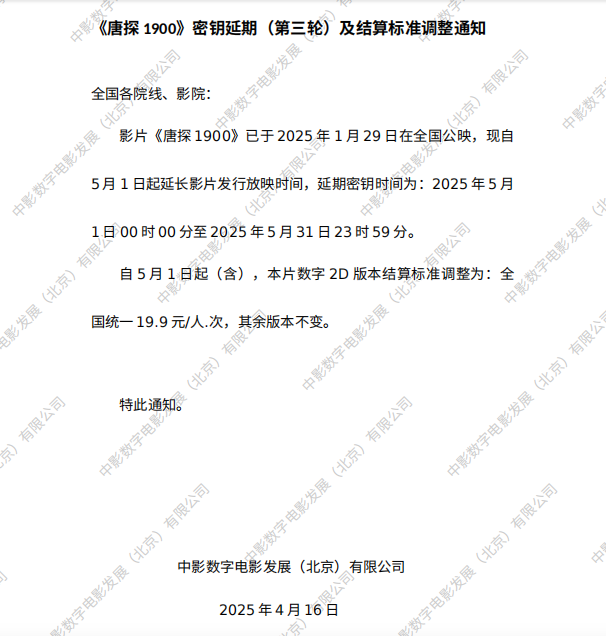 关于影片《唐探1900》二次密钥延期的通知