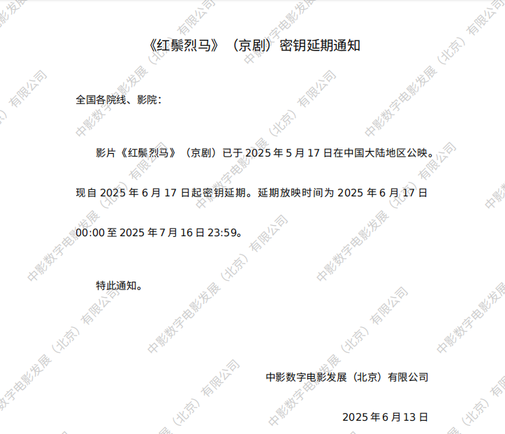 发行通知 » 《红鬃烈马(京剧)》密钥延期的通知