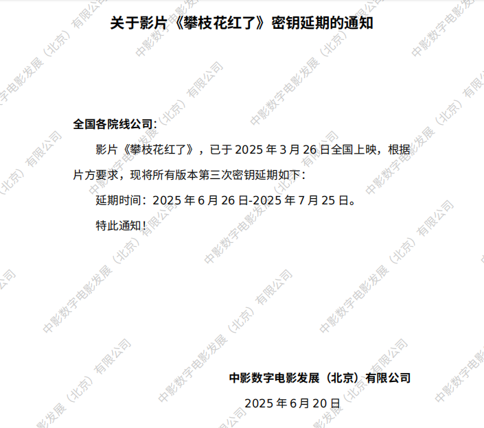 关于影片《攀枝花红了》第二次密钥延期的通知