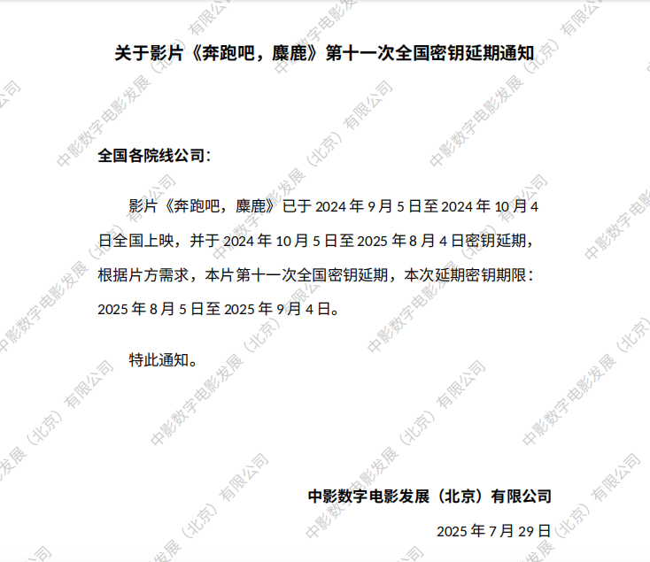 关于影片《奔跑吧,麋鹿》第九次全国密钥延期通知