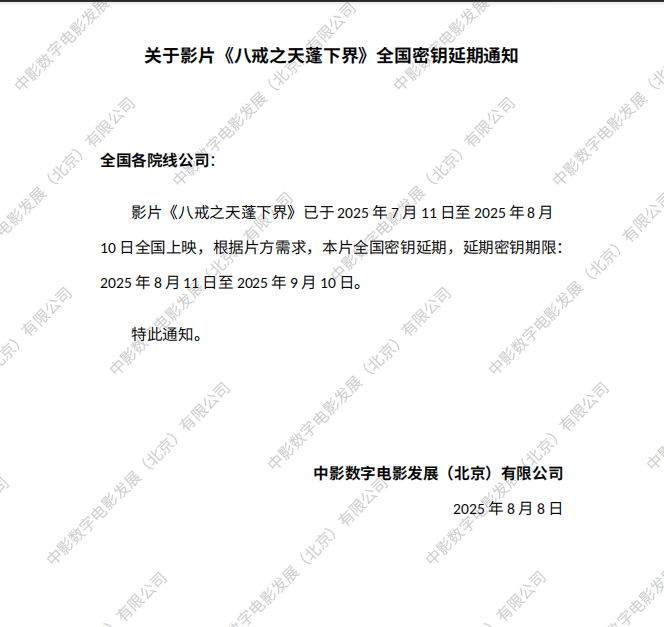 致院线-关于影片《八戒之天蓬下界》第八次全国密钥延期通知
