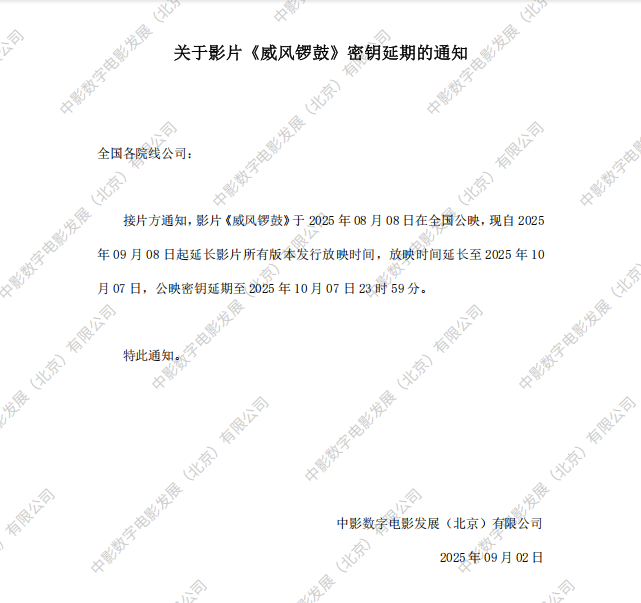 关于影片《威风锣鼓》2次密钥延期的通知