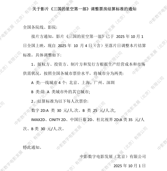 关于影片《三国的星空第一部》调整票房结算标准的通知