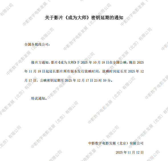 《成为大师》调整票房结算标准的通知
