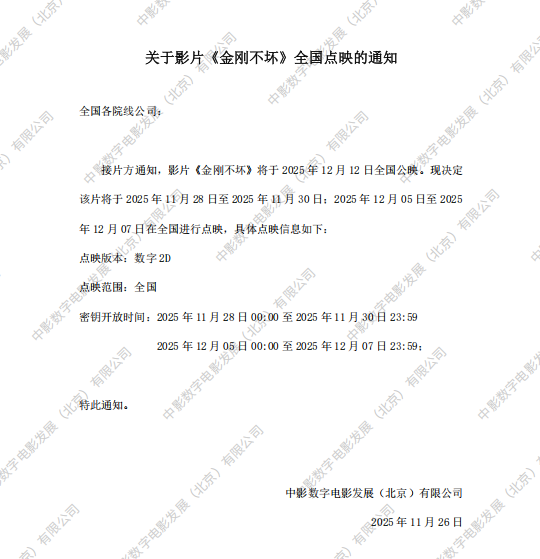 《金刚不坏》全国点映的通知