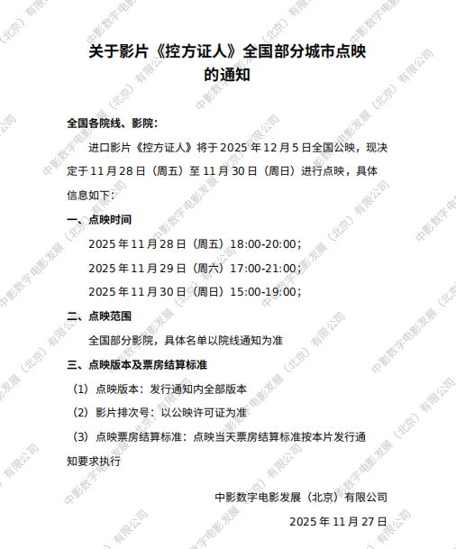 《控方证人》发行通知(第二次延期)