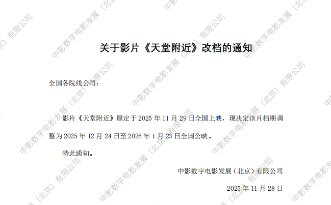 致院线-关于影片《天堂附近》全国密钥延期通知