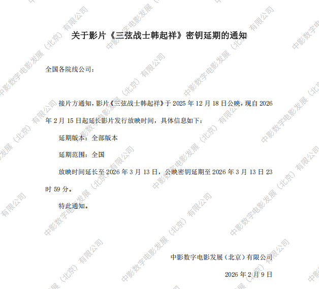 关于影片《三弦战士韩起祥》第三次密钥延期的通知