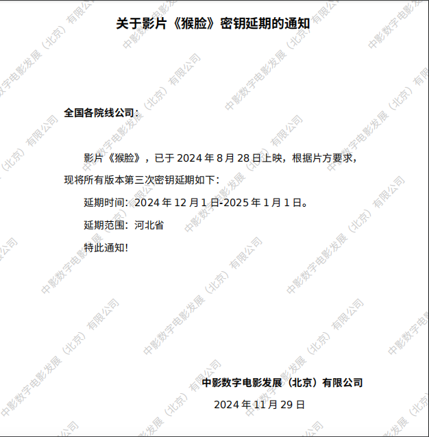 《猴脸》密钥延期的通知