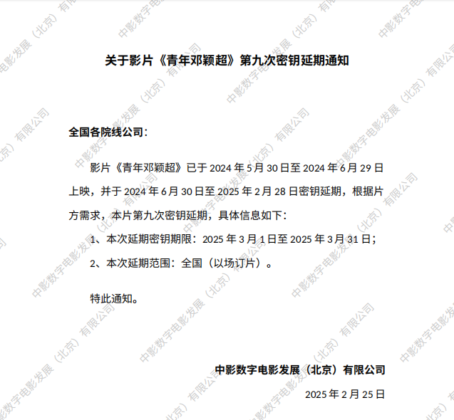 《青年邓颖超》第十次密钥延期的通知