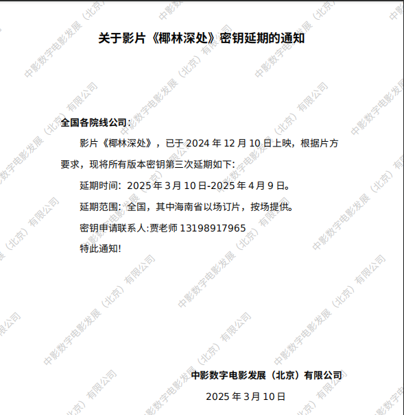 关于影片《椰林深处》第六次延期的通知